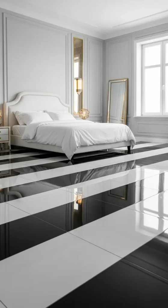Create vintage-inspired glamour with a black and white checkerboard floor pattern. Whether you choose tile, vinyl, or painted wood, this classic pattern adds instant character and visual impact. The geometric grid creates structure and makes the room feel more designed and intentional. Balance the busy floor with simpler bedding and wall treatments to prevent visual overload.
