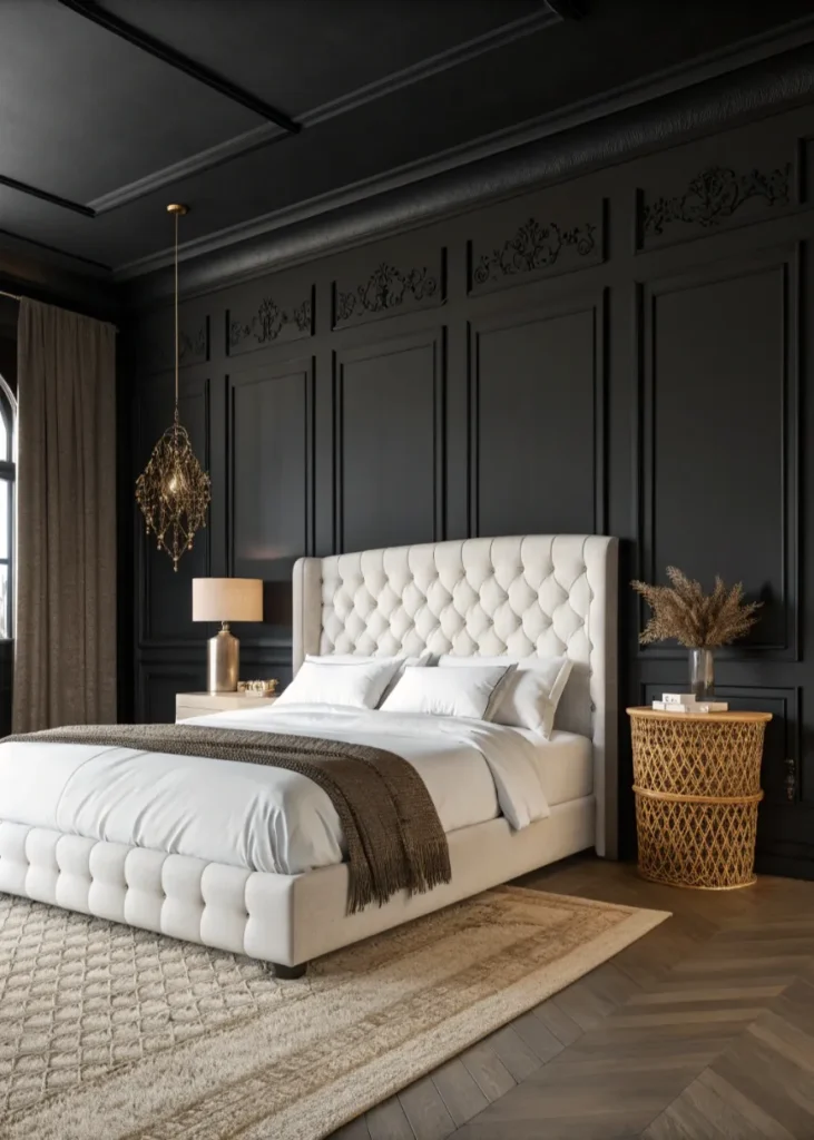 Paint one wall behind your bed in deep matte black to create a stunning focal point. This bold backdrop makes white furniture and bedding pop dramatically while adding depth to the room. The dark wall creates a cozy, intimate feeling that enhances the bedroom’s restful atmosphere. Add textured elements like wood or rattan to soften the look.