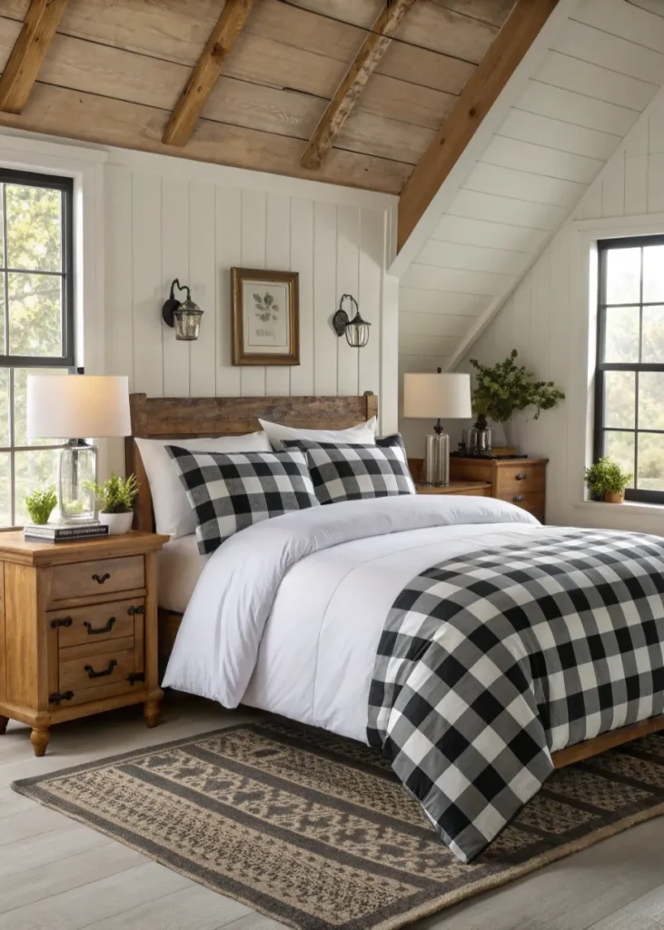 Incorporate cozy farmhouse style with black and white plaid or buffalo check patterns in bedding, curtains, or accent pillows. These classic patterns add warmth and texture that prevent the color scheme from feeling too stark or modern. The timeless appeal of plaid works beautifully in traditional, rustic, or cottage-style bedrooms. Mix the pattern with solid pieces to maintain balance.