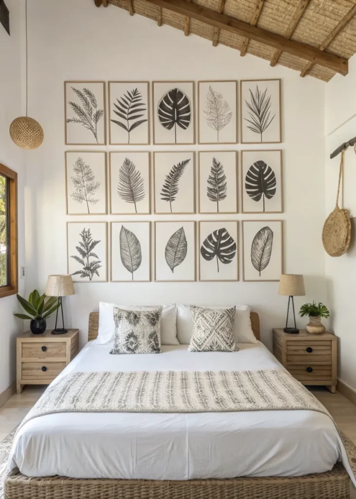 Bring nature indoors with framed black and white botanical prints or wallpaper featuring leaves, flowers, or branches. These organic patterns add softness and life to the structured color palette. Botanical elements create a calming, spa-like atmosphere perfect for rest and relaxation. Arrange multiple smaller prints in a grid pattern or choose one large-scale botanical wallpaper.