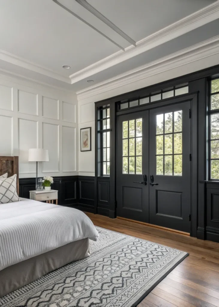 Add architectural interest by installing black painted wainscoting on the lower third of walls with white paint above. This classic two-tone treatment adds dimension and traditional elegance to any bedroom. The darker lower portion helps hide scuffs and marks while creating visual grounding. Continue the black trim around doors and windows for a cohesive look.