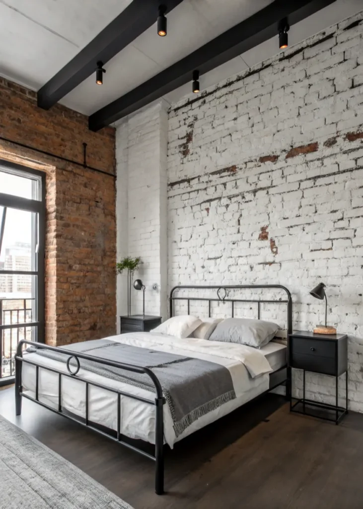 Expose or create a white painted brick accent wall that provides texture and industrial charm. The dimensional surface catches light beautifully and adds character without color. Ground the textured wall with sleek black furniture pieces that provide contrast and definition. This combination works perfectly in loft-style or urban contemporary bedrooms.