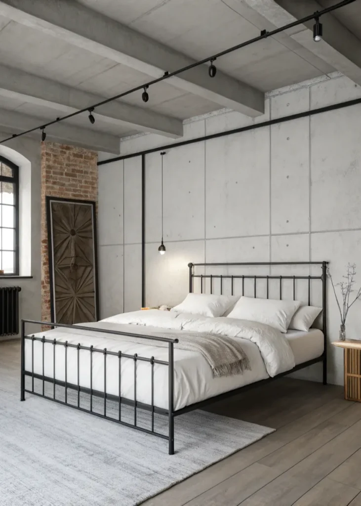 Choose a minimalist black metal bed frame with clean lines for an industrial or modern aesthetic. The slim profile takes up less visual space than upholstered options while still making a statement. Metal frames in matte black powder coat finishes feel current and sophisticated. Dress the bed with plush white bedding to soften the harder industrial element.