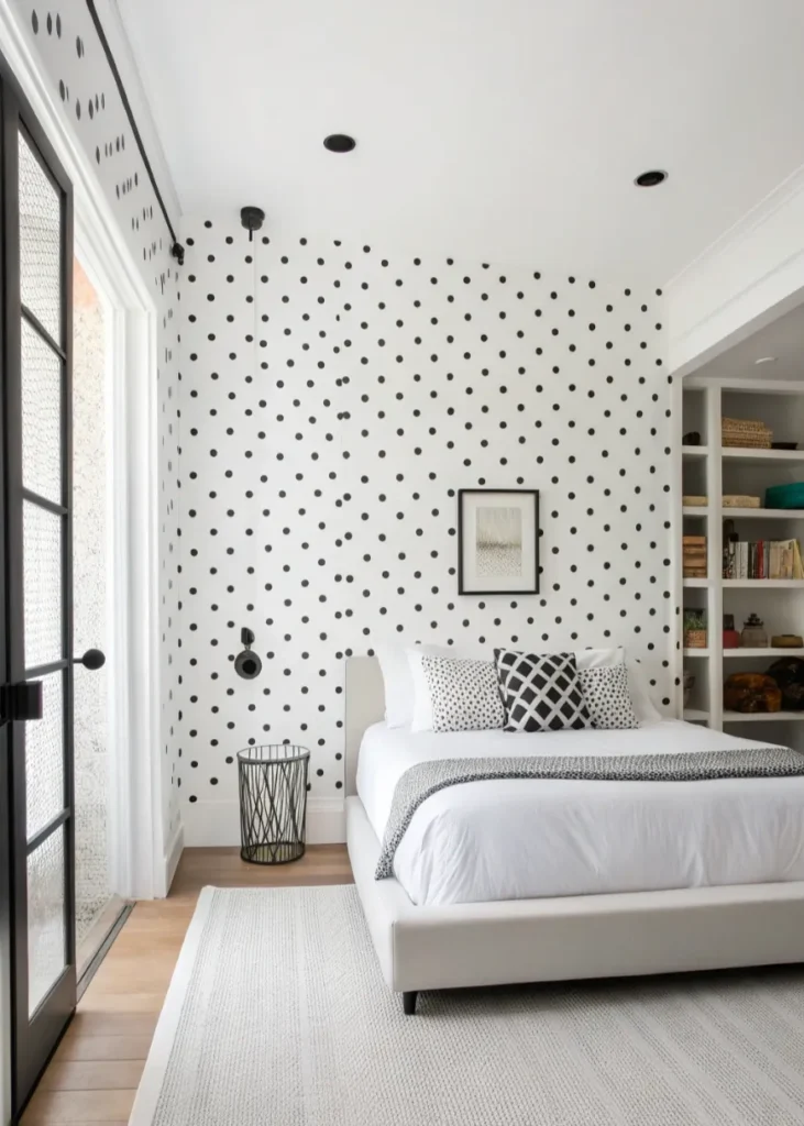 Add playful charm to your bedroom with black polka dot wallpaper on a white background. This fun pattern brings personality without overwhelming the space, especially when you choose small to medium-sized dots with plenty of negative space. Position the wallpaper behind your bed as an accent wall, and keep the remaining walls white to maintain an airy feel. This design works beautifully in both contemporary and retro-inspired bedrooms.