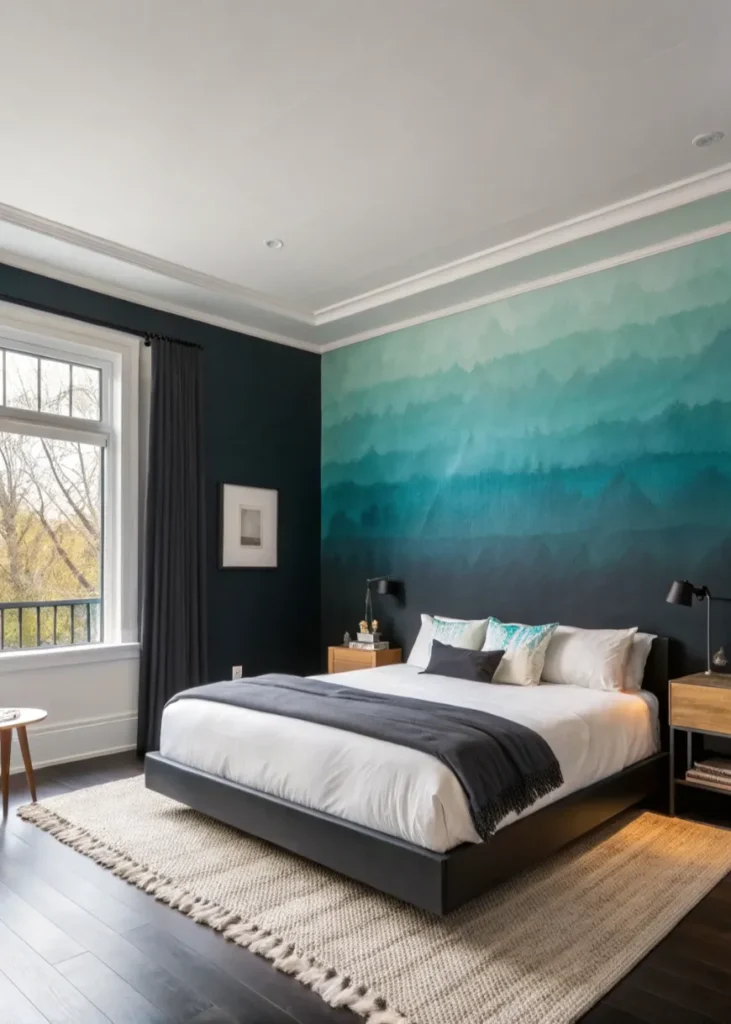 Create a gradient effect on one wall that transitions from deep black at the bottom to pure white at the top. This artistic treatment adds unique visual interest and serves as functional artwork. The ombre technique softens the stark contrast of pure black and white while maintaining the monochromatic scheme. This works especially well in bedrooms with tall ceilings.