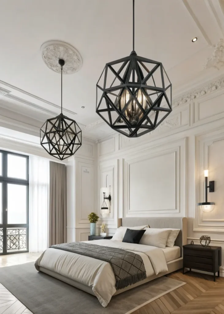 Replace standard lighting with statement black pendant lights or a chandelier that draws the eye upward. The dark fixture creates a striking contrast against white ceilings and adds sculptural interest. Choose geometric shapes for modern spaces or ornate designs for traditional rooms. Proper lighting fixtures can completely transform the mood and style of your bedroom.