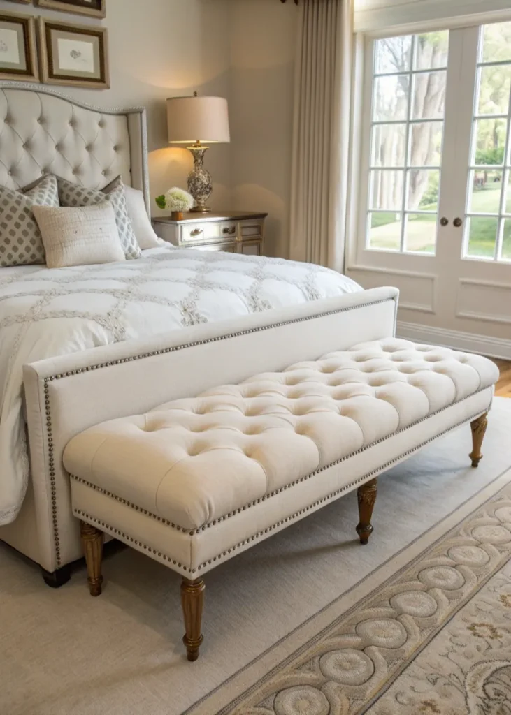 Add functionality and style with a white upholstered bench positioned at the foot of your bed. The soft furniture piece provides practical seating while adding a layer of luxury and comfort. Choose tufted, channel, or plain upholstery depending on your style preference. The white tone keeps the space feeling open while the added furniture creates a complete, designed look.