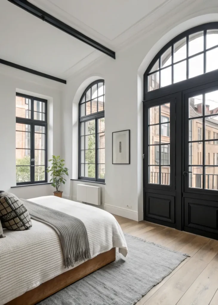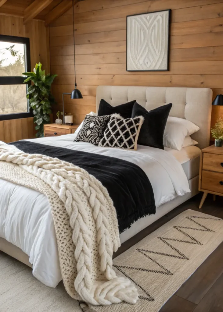Keep things simple and elegant with an all-white bed dressed up with carefully selected black throw pillows. This approach creates a hotel-like luxury that feels fresh and inviting. Mix pillow sizes and textures, incorporating velvet, linen, or faux fur in black to add dimension. The mostly white palette keeps the room feeling spacious and serene.