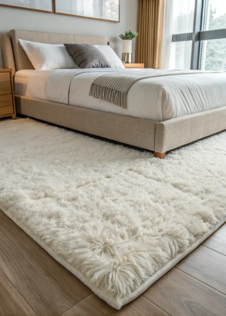 Soften hard flooring with a plush white shag or heavily textured area rug that adds comfort underfoot. The tactile element introduces warmth that prevents the black and white scheme from feeling cold. Position the rug under and extending beyond the bed to define the sleeping zone. The light color reflects light and helps the room feel more spacious.