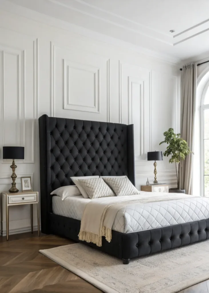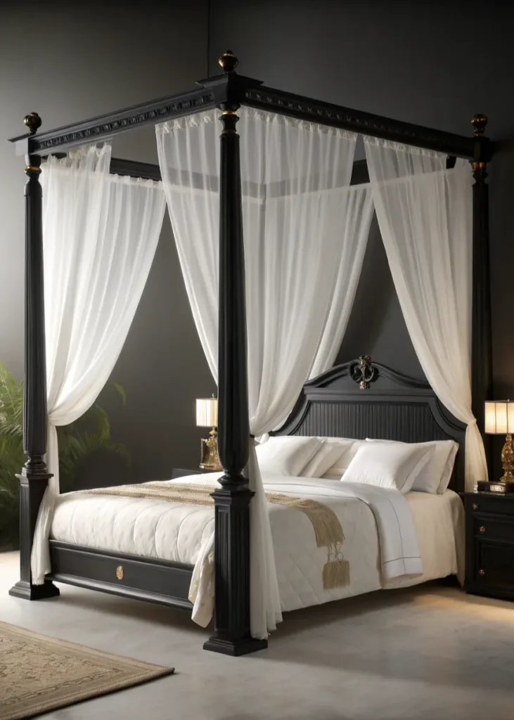 Make a stunning statement with a black four-poster or canopy bed frame that commands attention. The vertical lines of the posts draw the eye upward and create an elegant, romantic atmosphere. Drape sheer white curtains from the canopy for added softness and privacy, or leave it bare for a more modern, architectural look. This dramatic furniture piece becomes the undeniable star of your bedroom.
