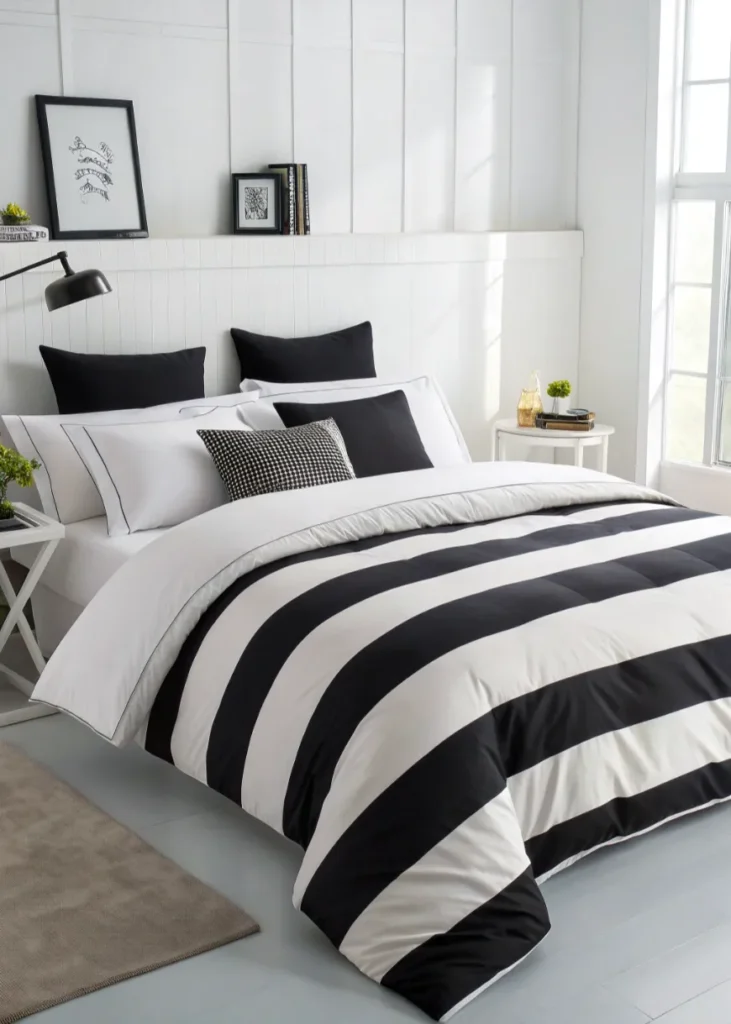 Transform your bed into a graphic masterpiece with bold black and white striped bedding. Horizontal stripes create a modern, streamlined look, while vertical stripes can make your bed appear taller. Mix stripe widths for added visual interest, pairing thick statement stripes with thinner accent patterns. This classic pattern never goes out of style and serves as a perfect foundation for layering solid pillows and throws.