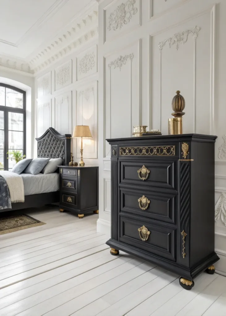 Ground your white-painted bedroom with strategic black furniture pieces that provide visual weight and sophistication. A black nightstand, dresser, or bench creates strong contrast against light floors and walls. Choose pieces with interesting details like carved legs, brass hardware, or unique shapes to add character. This approach allows flexibility to incorporate other accent colors through bedding and decor.