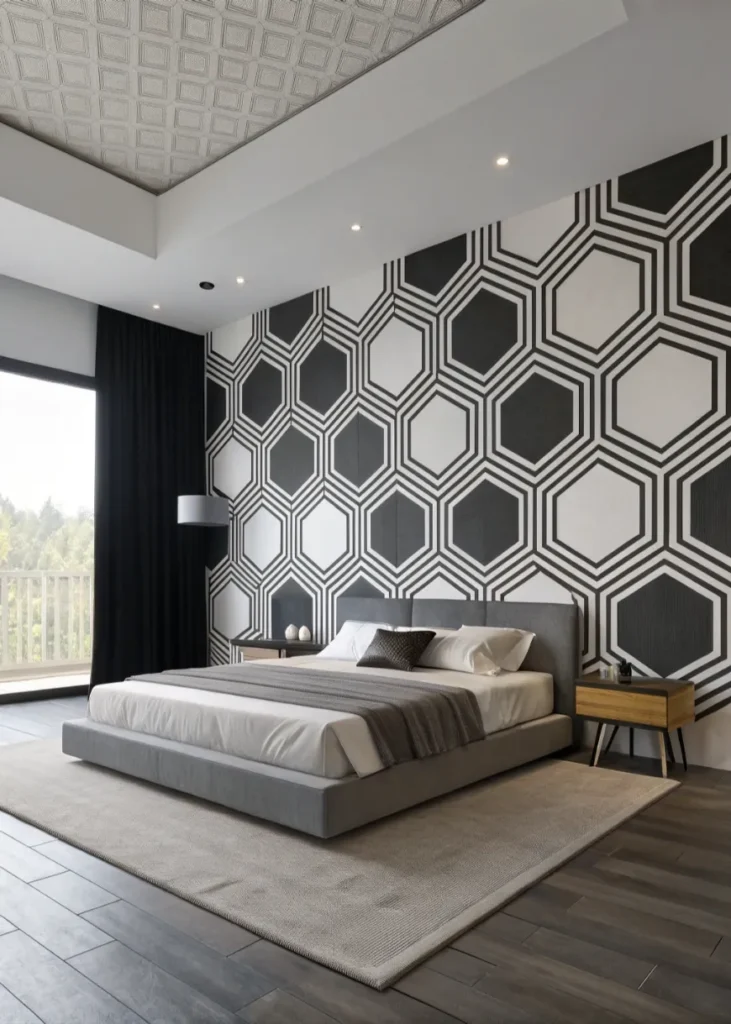 Embrace modern design with geometric wallpaper featuring bold black patterns on white backgrounds. Hexagons, chevrons, or abstract shapes create dynamic visual energy that transforms plain walls into conversation pieces. Apply the wallpaper to one accent wall to avoid overwhelming the space, and keep furnishings simple to let the pattern shine. This contemporary approach works especially well in smaller bedrooms.