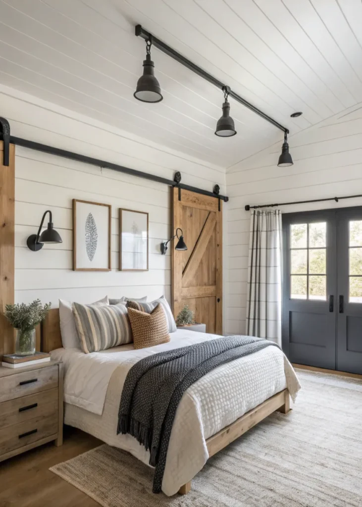 Bring farmhouse charm to your bedroom with white painted shiplap walls accented by black metal light fixtures and hardware. The horizontal lines of shiplap add texture and interest while maintaining a clean, bright feel. Incorporate black elements through curtain rods, door handles, and picture frames to create cohesive contrast. This design feels both rustic and refined.