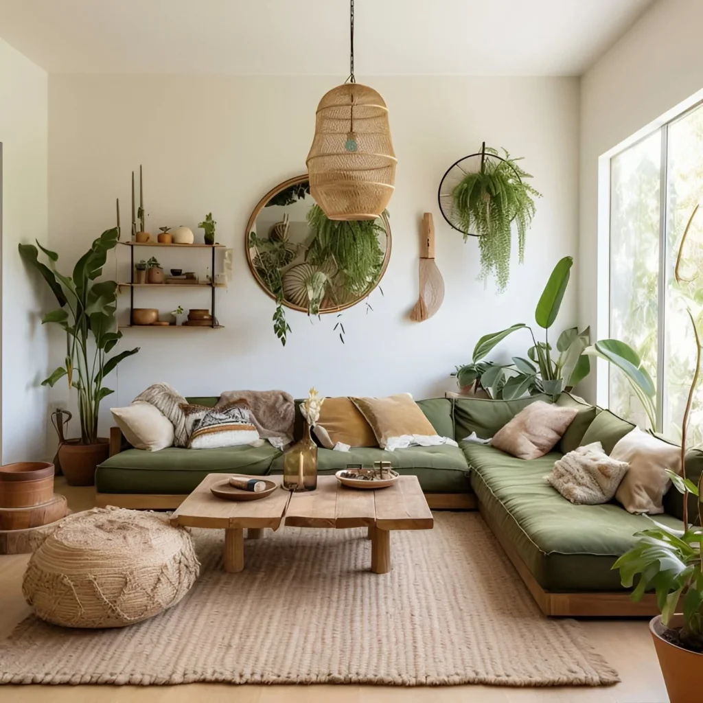 Soft tasseled blankets and earthy pillows bring immediate comfort to the grey sectional sofa. You should use macramรฉ plant hangers and small wooden benches to introduce more organic elements to the space. These simple additions transform a modern Cozy Living Room into a welcoming, nature-inspired sanctuary.