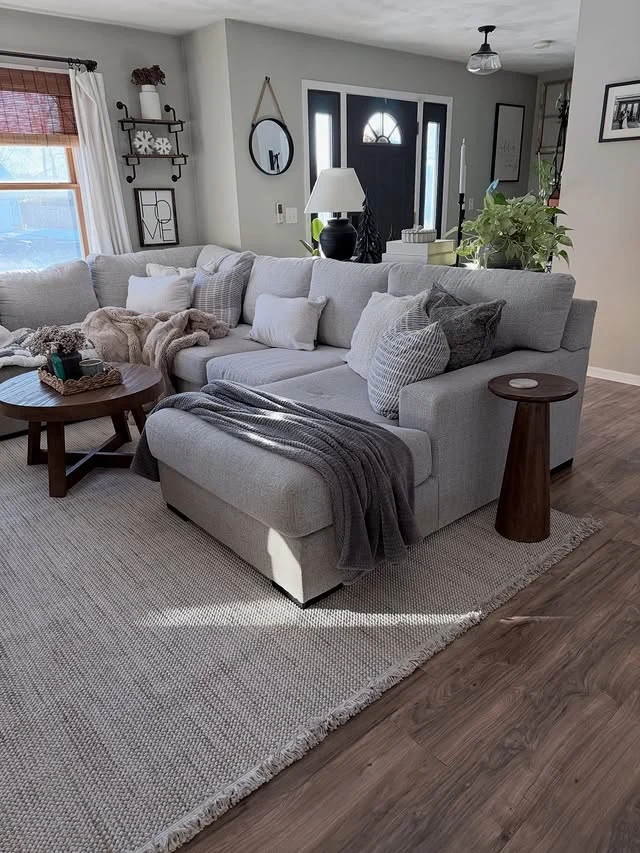 Textured pillows and a thick knit throw instantly elevate this Cozy Living Room setup. You will find that a large, fringed area rug anchors the sectional while adding a soft layer underfoot. The dark wood side tables provide a rich contrast to the light grey upholstery of the couch.