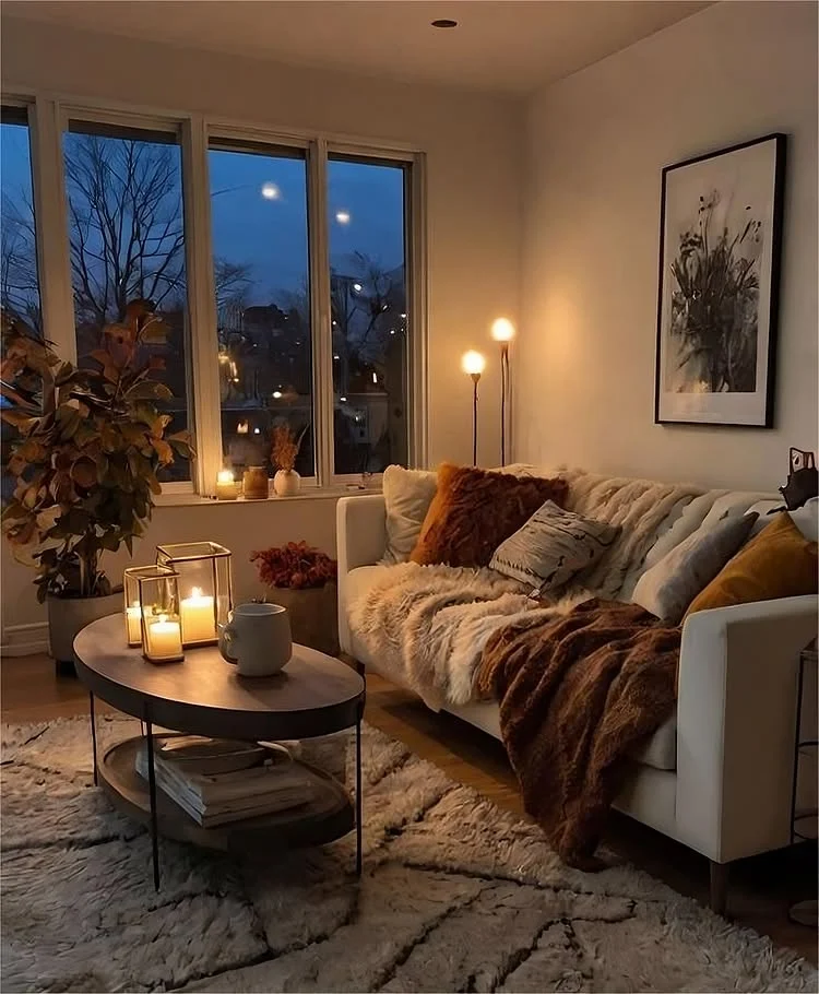 Multiple sources of soft, warm lighting come together to create a truly Cozy Living Room atmosphere. You can replicate this look by layering table lamps, floor lamps, and wall sconces to avoid harsh overhead glares. I love how the flickering candles on the coffee table add a final touch of intimate, natural light to the seating area.