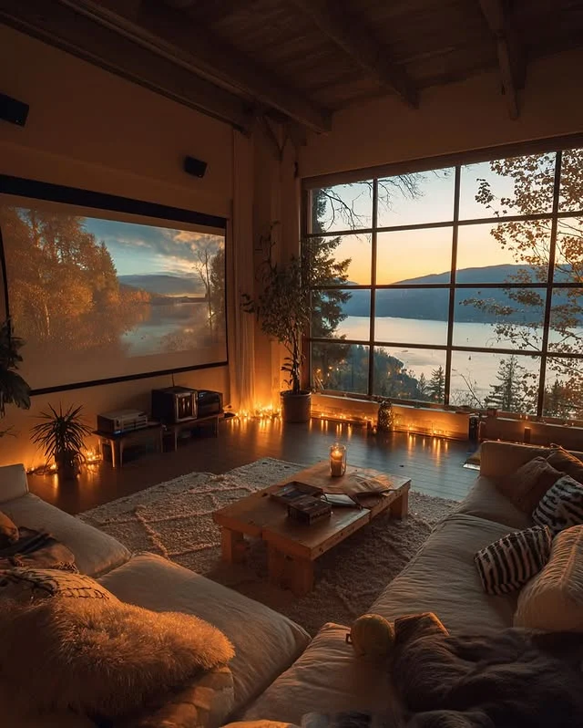 Golden hour light fills this Cozy Living Room, creating a magical movie night setting. You can frame a large window with twinkling string lights to mirror the stars outside. I love how the oversized floor cushions provide a front-row seat to the breathtaking lake scenery.