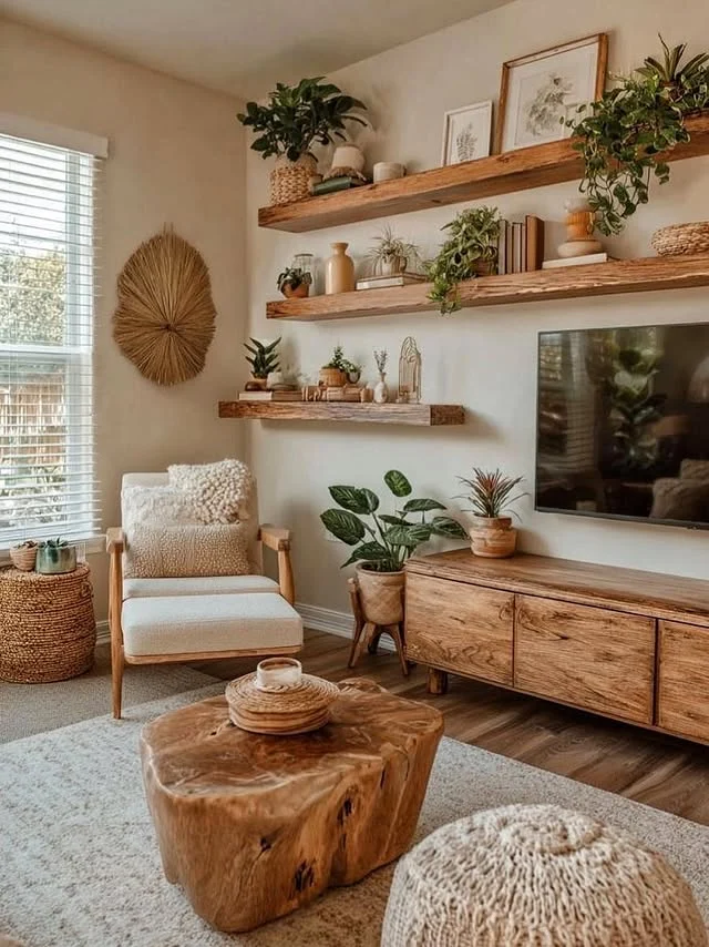 Natural wood and woven fibers create a stunning Cozy Living Room full of earthy charm. You will love how the floating timber shelves provide a perfect stage for trailing indoor plants and vintage books. I find that mixing wood grains with soft cream textiles adds immediate warmth to any seating area.