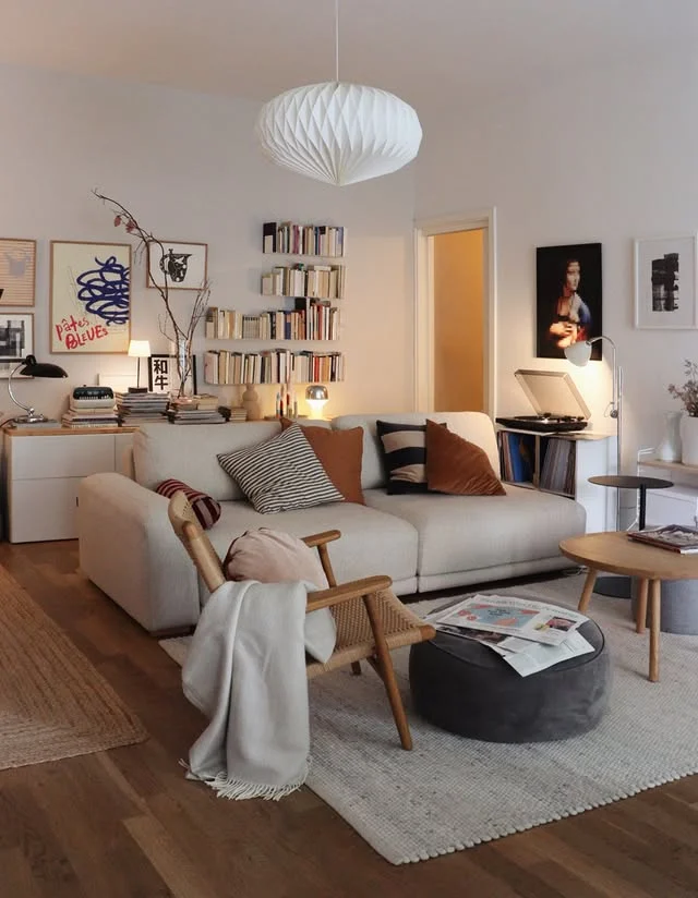 I recommend using a striped rug to define the seating area and add visual depth. A low wooden coffee table keeps the sightlines open while providing a functional surface for decor. These simple elements work together to make your Cozy Living Room feel both organized and peaceful.