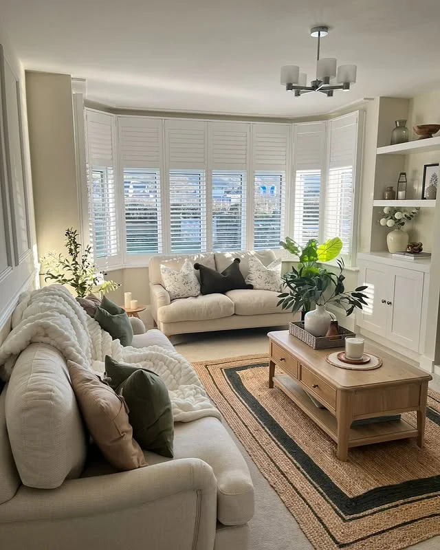 Natural light pours through elegant white shutters to create a refreshing Cozy Living Room. You can use soft sage and forest green pillows to bring a touch of nature indoors. I love how the chunky knit throw adds immediate tactile comfort to the cream-colored sofa.