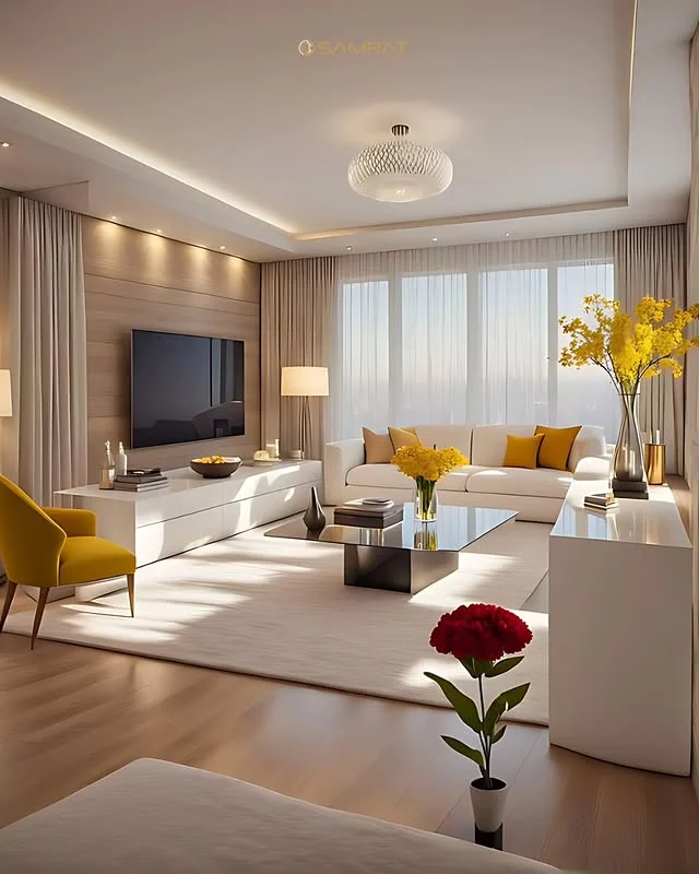 Natural sunlight pours into this airy Cozy Living Room, highlighting the crisp white furniture and warm wooden floors. You will notice how the bright yellow chairs and floral arrangements inject a cheerful energy into the space. High ceilings and floor-to-ceiling windows make this modern sanctuary feel incredibly spacious yet welcoming.