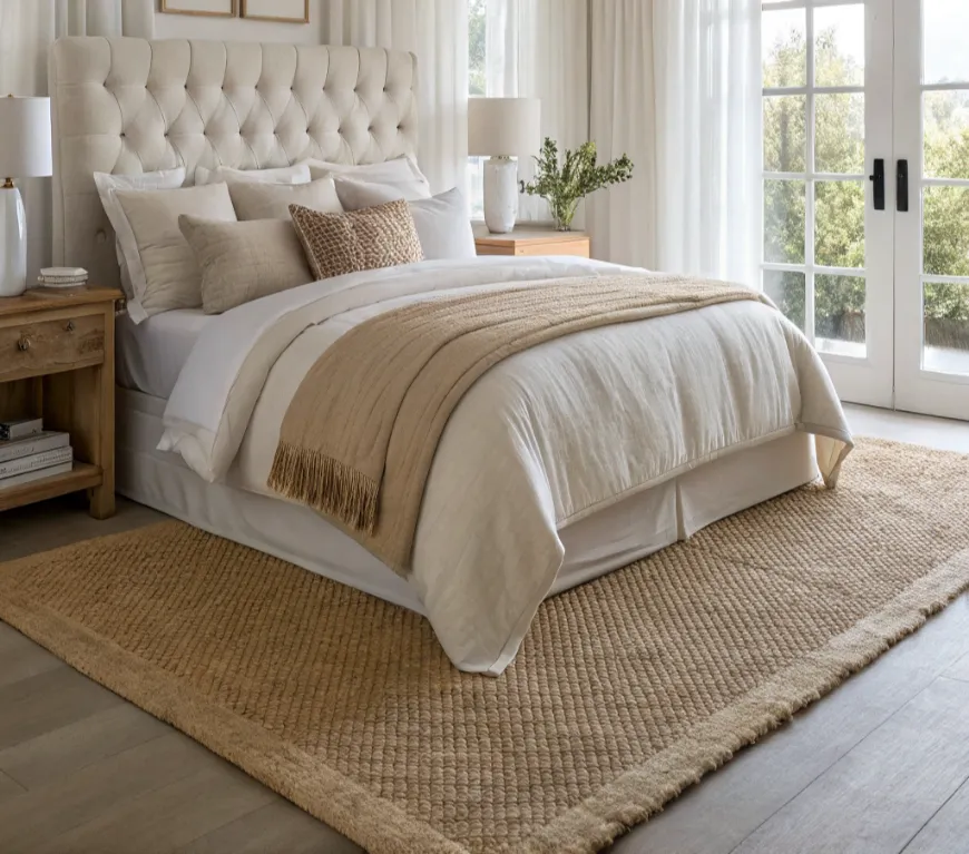 Choose a white or cream upholstered headboard as your focal point and build from there. Add warmth through natural wood nightstands and a jute area rug beneath the bed. Keep window treatments simple with flowing white curtains that allow natural light to filter through softly.