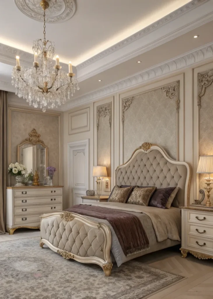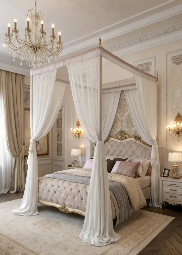 Layer luxurious bedding with soft textures like silk pillows and velvet throws. Add romantic lighting through crystal chandeliers or delicate wall sconces. Keep the color palette soft with whites, creams, and blush tones for maximum romance.
