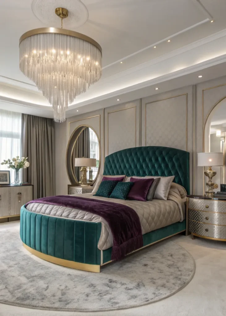 Channel old Hollywood with glamorous master bedroom ideas that celebrate luxury and drama. Choose furniture with curved lines, mirrored surfaces, and metallic finishes. Add plush textiles in rich colors like emerald, sapphire, or deep plum paired with gold or silver accents.