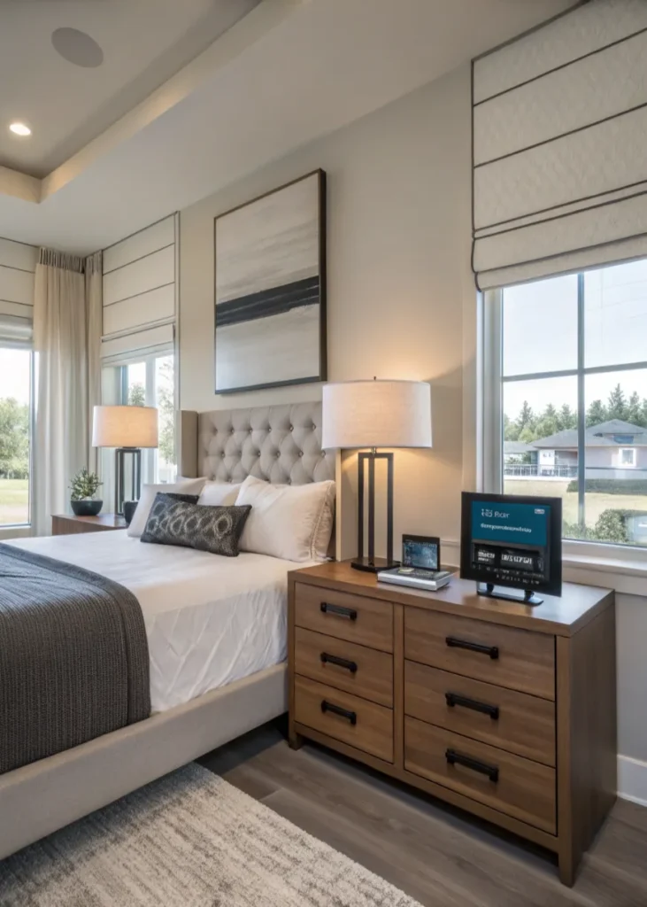 Embrace modern convenience with tech-integrated master bedroom ideas that prioritize functionality. Include smart lighting controlled by voice or phone, automated window treatments, and charging stations built into nightstands. Add a smart thermostat for perfect temperature control.