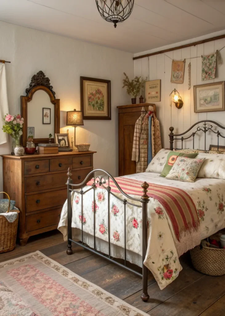 This nostalgic master bedroom idea creates spaces with soul and stories. The vintage pieces add personality and sustainability through reuse of quality furniture.