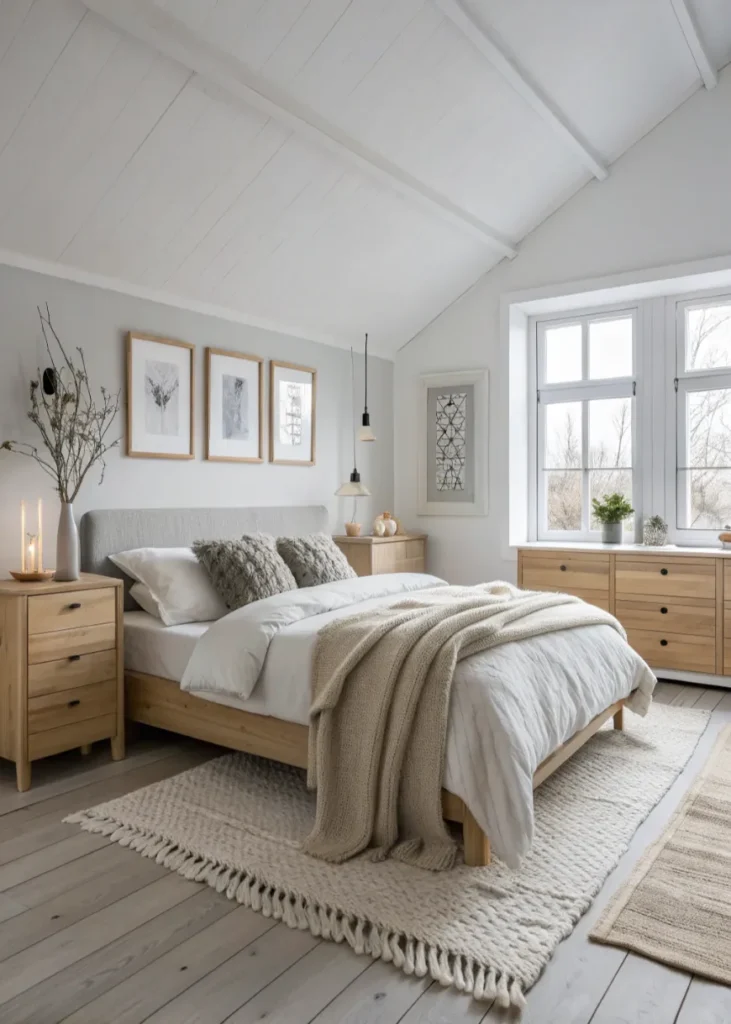 Keep decorative elements minimal but meaningful with simple artwork, candles, and perhaps one plant. Focus on functionality and comfort over excessive decoration. The Scandinavian approach values quality, simplicity, and creating cozy atmospheres.