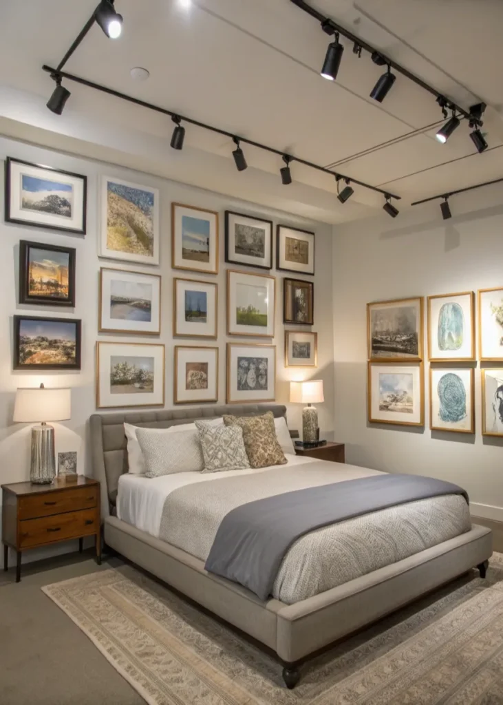 Keep other design elements relatively simple to let the artwork shine. Choose neutral bedding and furniture that don’t compete with the art for attention. Add proper lighting with picture lights or adjustable spotlights to highlight your collection.