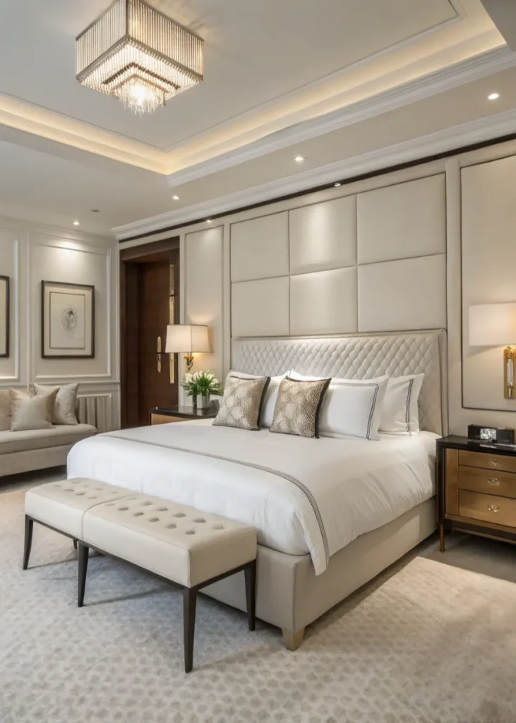 Add a upholstered bench at the foot of the bed and matching nightstands with sleek lamps. Include dimmable lighting to create ambiance and a seating area if space allows. The key is maintaining clean lines and avoiding clutter to achieve that hotel suite perfection.