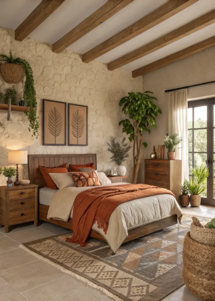 This cozy master bedroom idea suits those who love the warmth of country living combined with modern comfort. The rustic elements add character while soft textiles ensure the space remains inviting and comfortable.