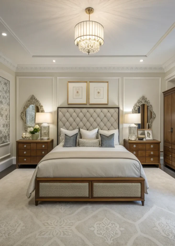 This sophisticated master bedroom idea appeals to those who appreciate traditional design and find peace in order. The symmetrical arrangement creates spaces that feel established and thoughtfully composed.
