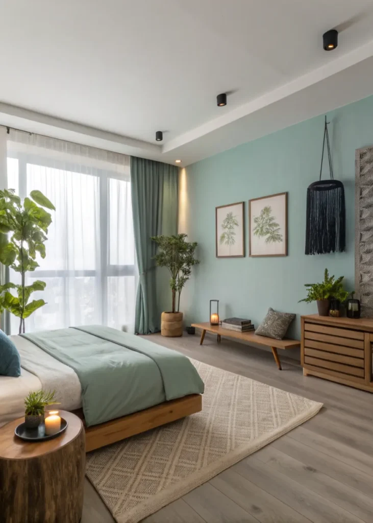 Choose furniture in natural wood tones and add organic materials like jute, bamboo, and linen. Keep the color palette nature-inspired with greens, browns, and creamy neutrals. The botanical theme creates connection with nature even in urban settings.