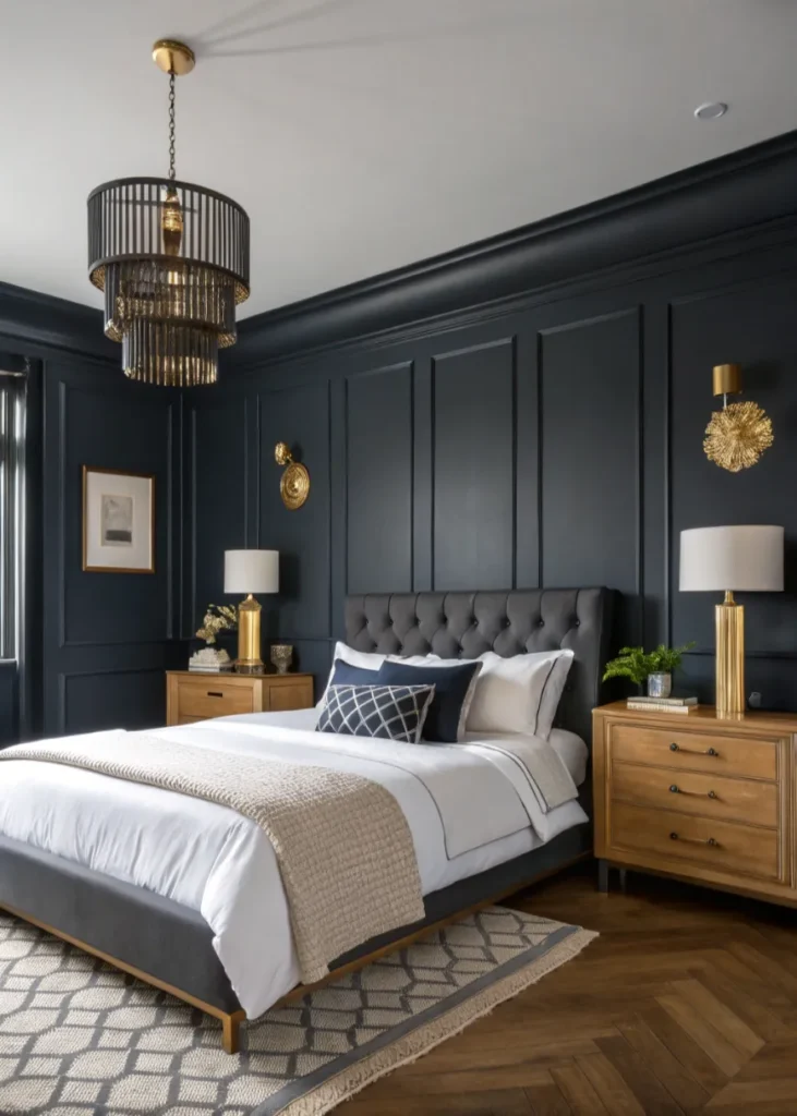Layer lighting carefully with bedside lamps, overhead fixtures, and accent lighting to ensure the room remains functional despite the dark walls. Choose furniture in lighter woods or white finishes to provide visual contrast against the dramatic backdrop.