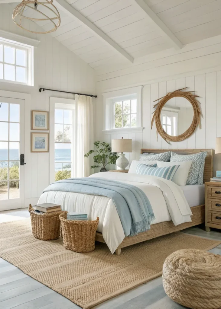 This refreshing master bedroom idea creates a permanent vacation atmosphere. The coastal aesthetic promotes relaxation and brings the calming influence of the ocean into your daily life.
