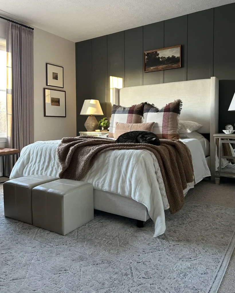 A deep charcoal paneled wall creates the ultimate moody bedroom focal point in this stunning space. You will notice how the dark vertical lines add immediate height and drama to the room. This bold design choice makes the light-colored headboard pop beautifully against the background.