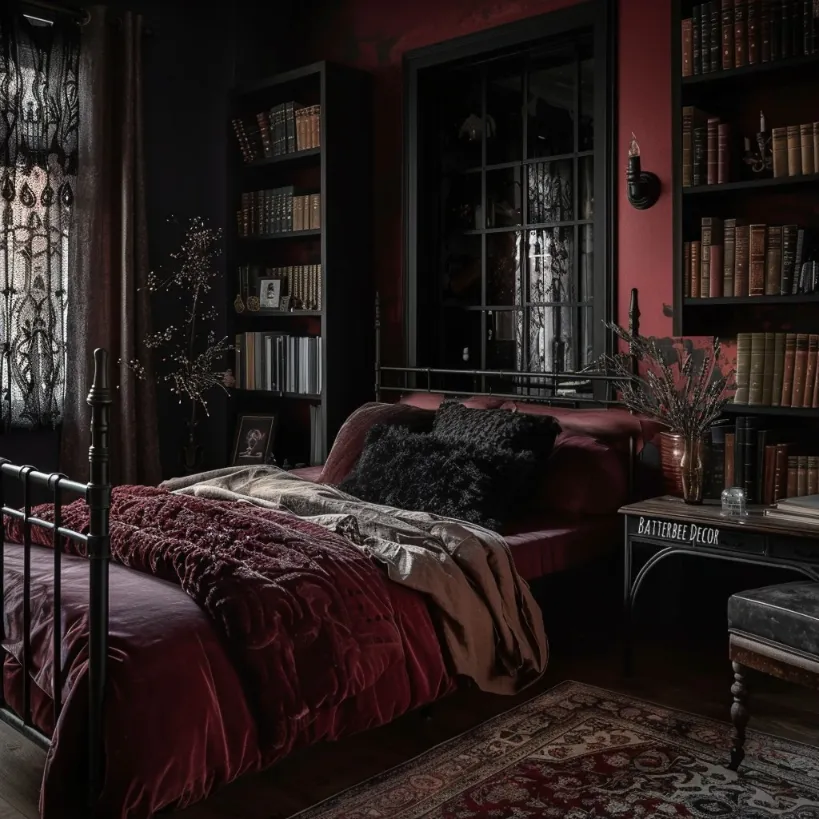 I suggest pairing velvet bedding with antique metal frames to enhance the gothic charm. You can display vintage books to add a scholarly feel to the space. These rich textures ensure your sanctuary feels both dark and incredibly luxurious.