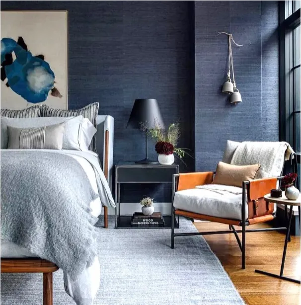 Textured navy wallpaper creates a sophisticated and moody bedroom backdrop in this modern seating area. You will notice how the grasscloth material adds a rich, organic feel to the walls. This deep blue hue provides a calm environment while maintaining a very high level of style.