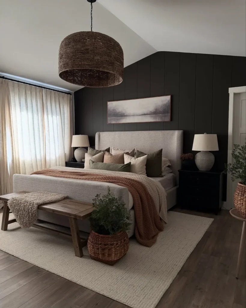 A stunning charcoal vertical shiplap wall creates a bold and moody bedroom focal point in this high-ceilinged space. You will see how the dark backdrop makes the light linen headboard and woven pendant light stand out beautifully. This design perfectly balances modern drama with earthy, rustic elements for a grounded feel.
