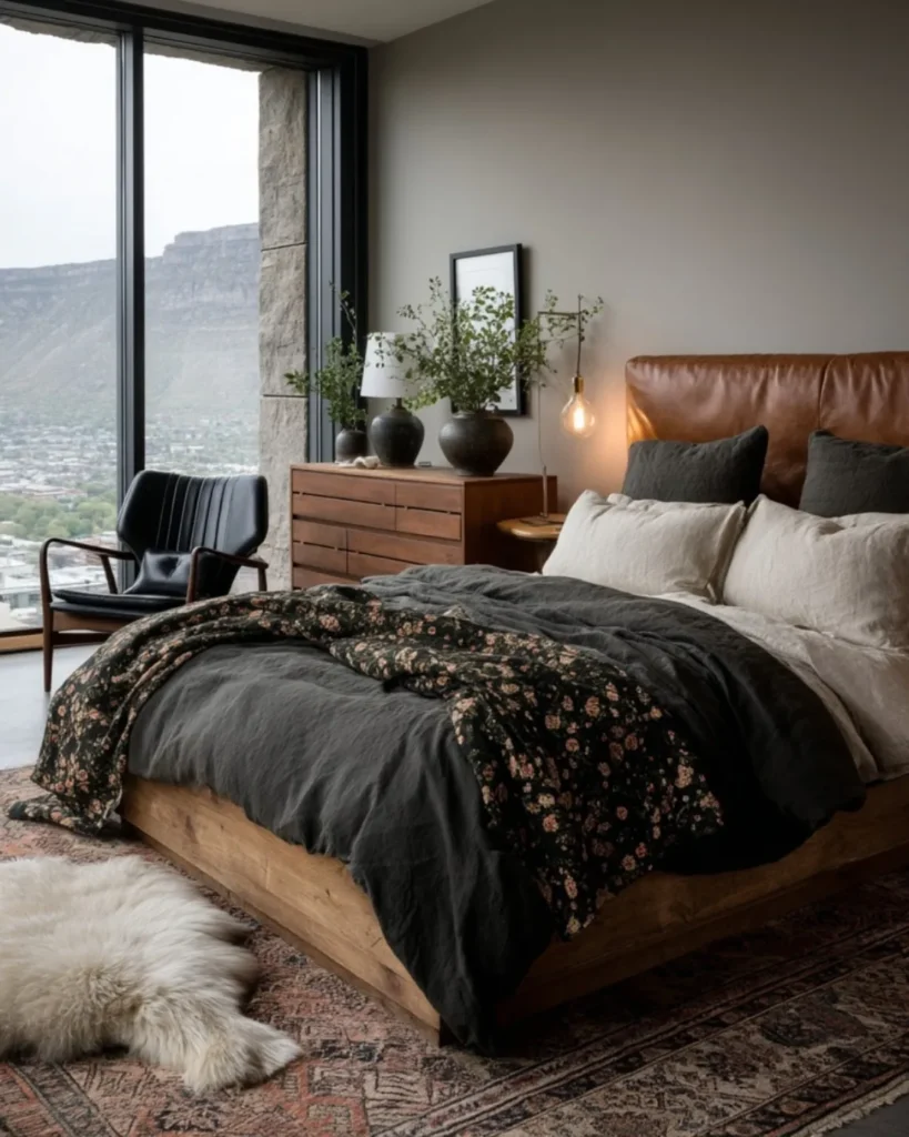A rich caramel leather headboard anchors this moody bedroom with an undeniable sense of luxury. I love how the dark floral duvet adds a vintage touch to the modern wooden bed frame. This blend of masculine textures and soft patterns creates a sophisticated space that feels lived-in and high-end.
