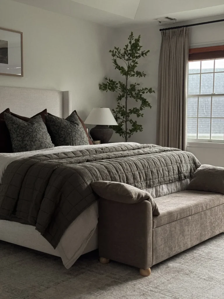 I love using tall indoor greenery to bring life to the corner of the room. You can pair patterned charcoal pillows with neutral linens to create a grounded, expert look. These thoughtful textures ensure your sleeping area remains cozy and visually interesting throughout the day.