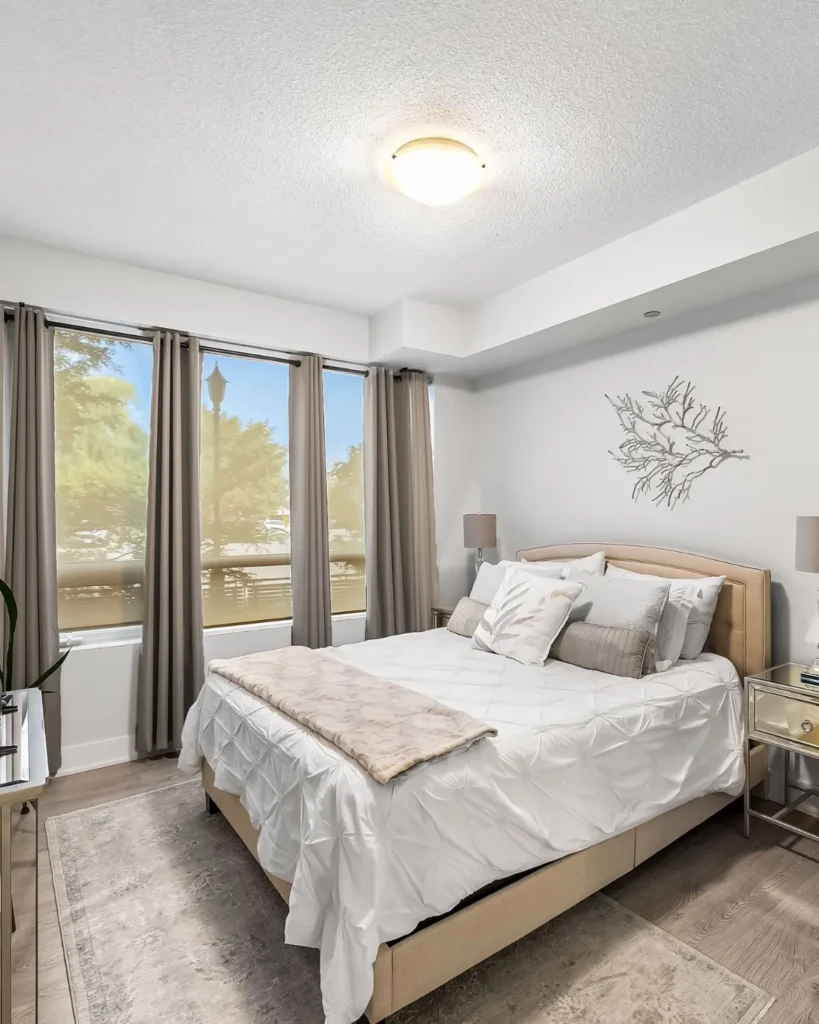 Crisp white walls and large windows create a luminous foundation for this airy moody bedroom alternative. You will notice how the plush white bedding and tufted tan headboard maintain a clean, sophisticated aesthetic. This bright design maximizes natural light to make the sleeping area feel incredibly spacious and fresh.