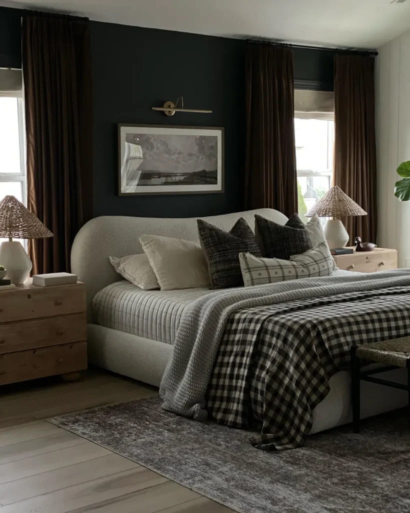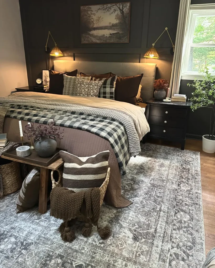I suggest layering a plaid wool throw over a chocolate brown quilt to introduce a classic, rustic pattern. You can use a vintage-inspired distressed rug to tie the dark walls and light wood floors together seamlessly. These thoughtful layers, combined with natural greenery and curated bedside decor, ensure your private sanctuary feels both high-end and incredibly inviting.
