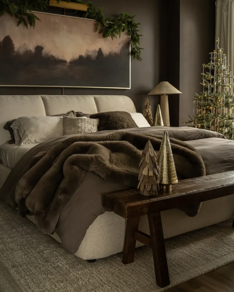 A rich espresso wall creates a stunning backdrop for the textured cream bed in this winter-themed moody bedroom. You will love how the oversized landscape art and draped evergreen garland bring a touch of the outdoors inside. This expert styling makes the space feel festive yet sophisticated for the holiday season.