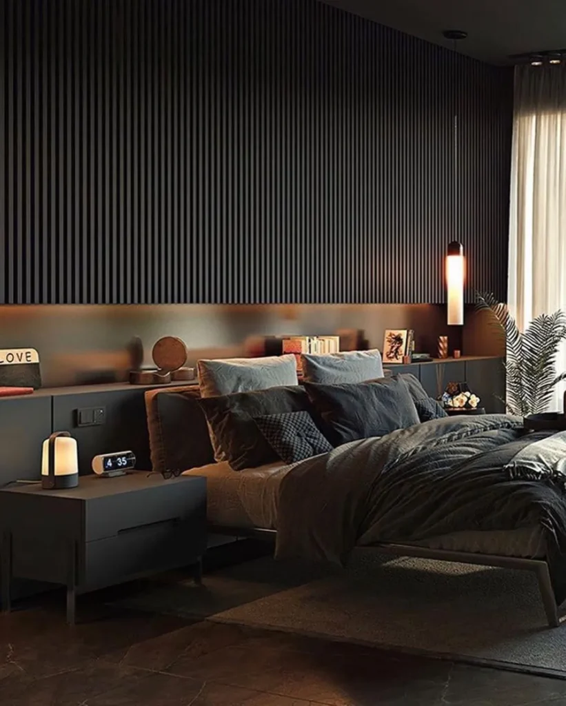 Vertical black slats create a sophisticated and moody bedroom backdrop in this ultra-modern sleeping area. You will notice how the built-in ledge provides a sleek surface for minimalist decor and ambient lighting. This architectural detail adds immense texture while maintaining a clean and focused design.