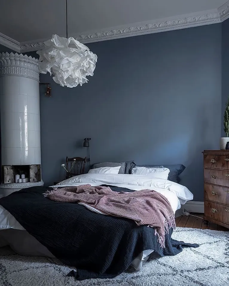 Cool slate blue walls and intricate white crown molding create a serene and moody bedroom atmosphere in this spacious retreat. You will love how the oversized, paper-like pendant light adds a soft, cloud-like texture above the bed. This design choice brings a sense of airy lightness to the room’s deeper tones, making it feel both modern and ethereal.